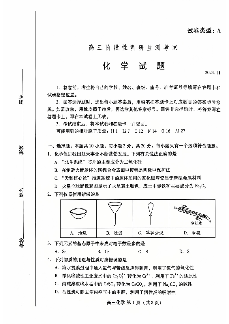 山东省潍坊市2025届高三上学期阶段性调研监测考试 化学