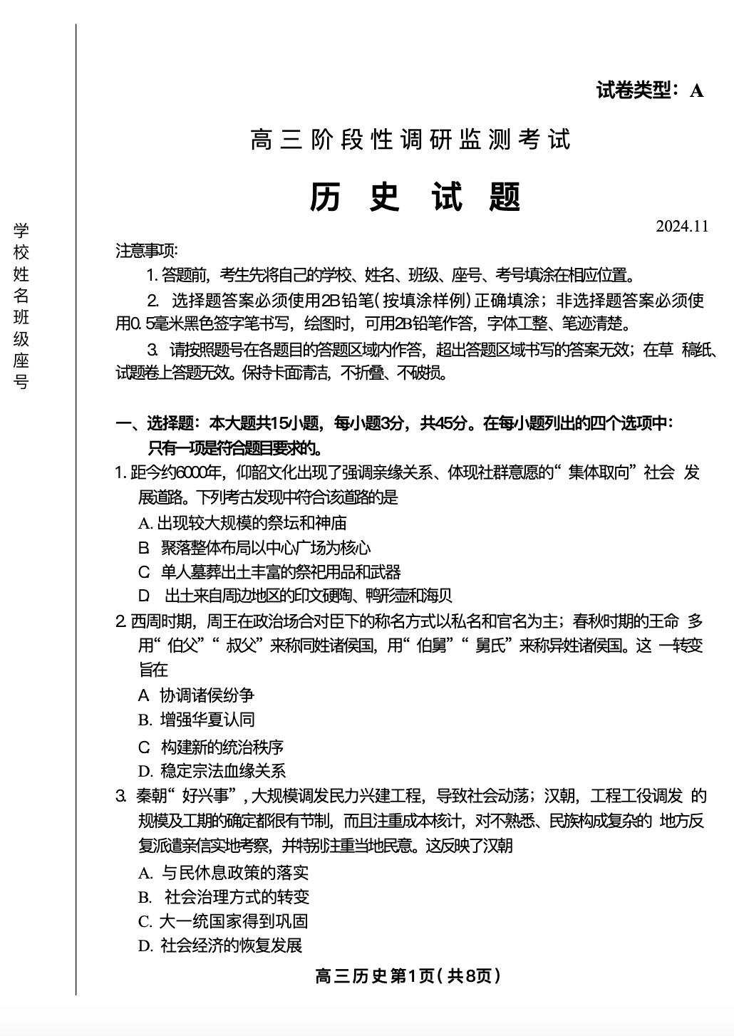 山东省潍坊市2025届高三上学期阶段性调研监测考试 历史