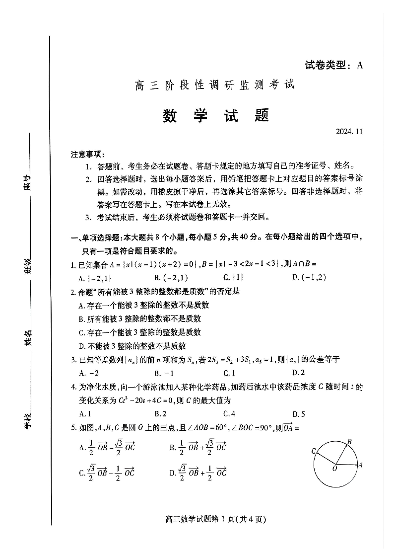 山东省潍坊市2025届高三上学期阶段性调研监测考试 数学