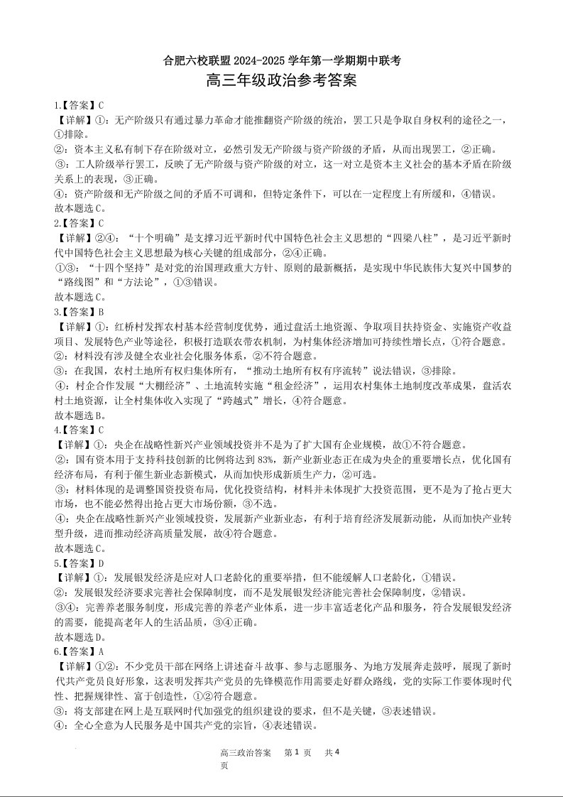安徽省合肥市普通高中六校联盟2025届高三上学期11月期中联考 政治答案