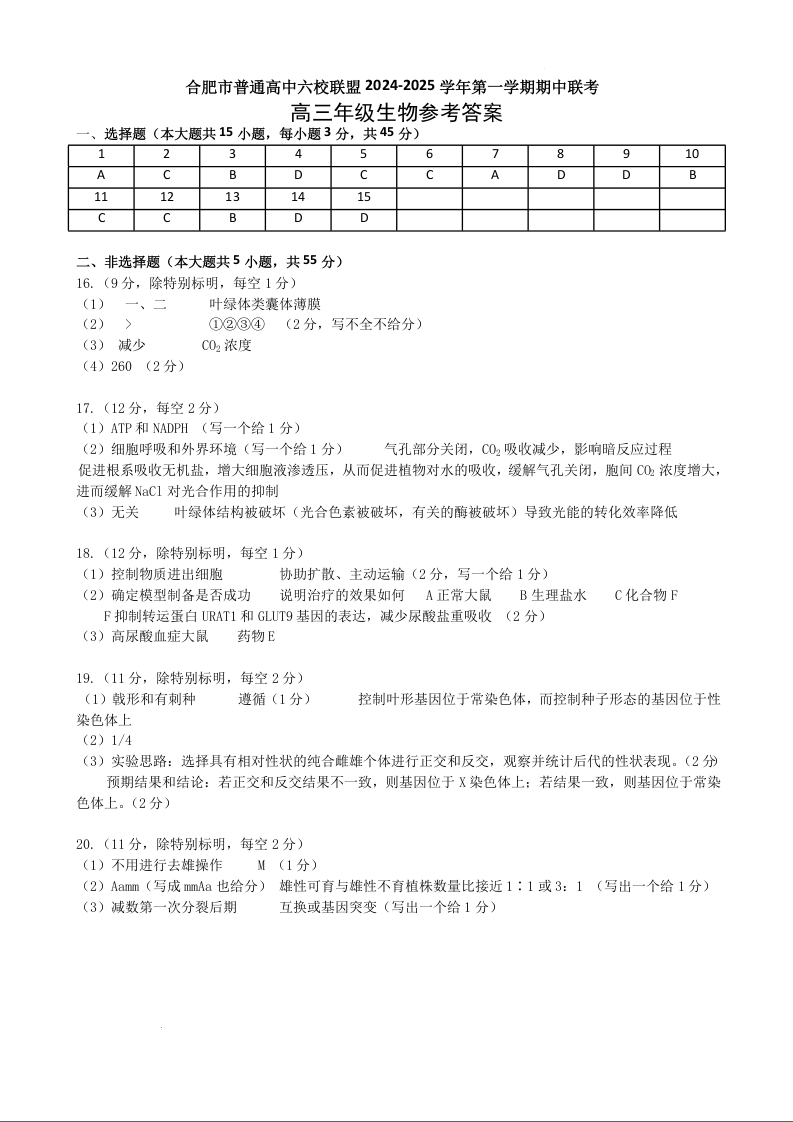 安徽省合肥市普通高中六校联盟2025届高三上学期11月期中联考 生物答案