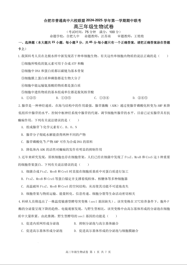 安徽省合肥市普通高中六校联盟2025届高三上学期11月期中联考 生物