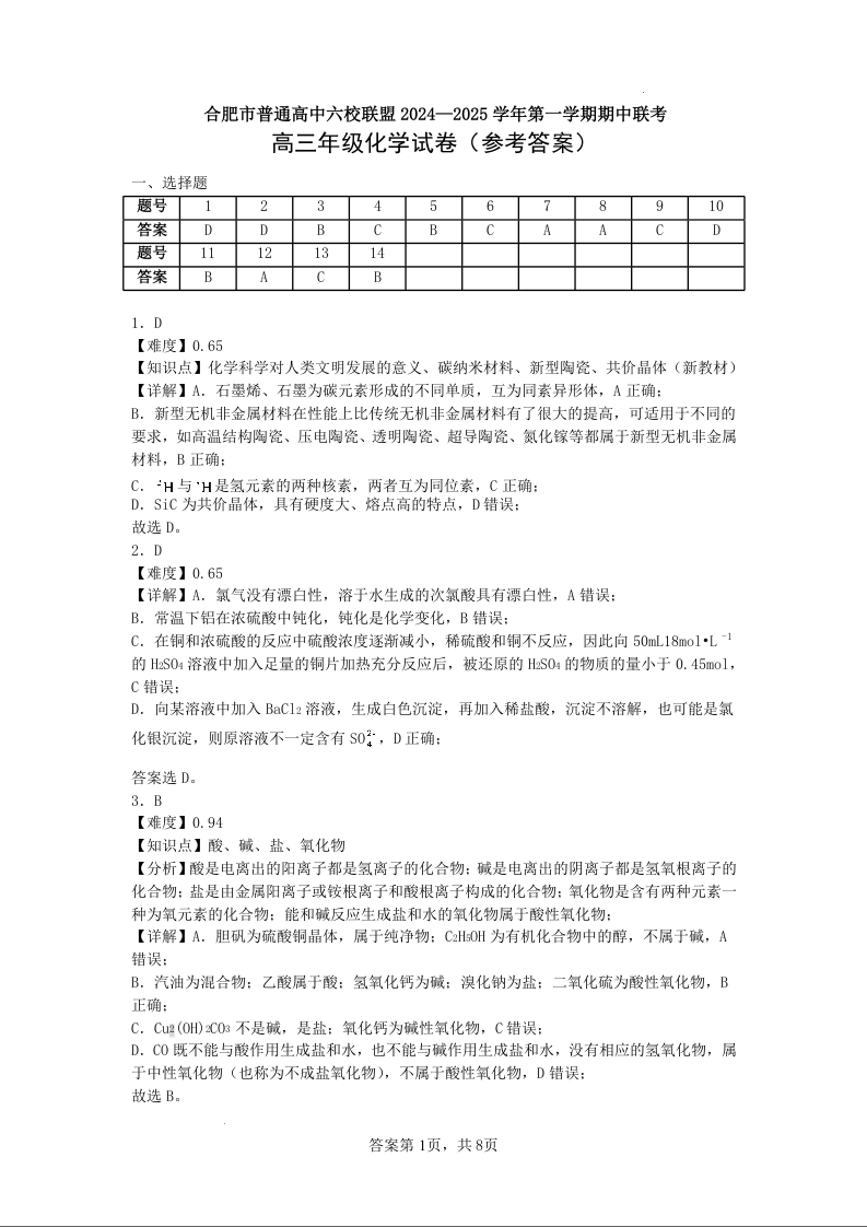 安徽省合肥市普通高中六校联盟2025届高三上学期11月期中联考 化学答案