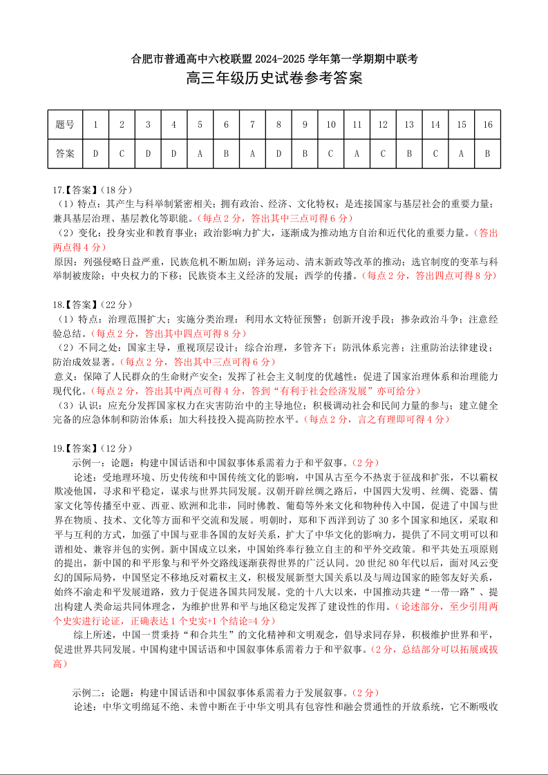 安徽省合肥市普通高中六校联盟2025届高三上学期11月期中联考 历史答案