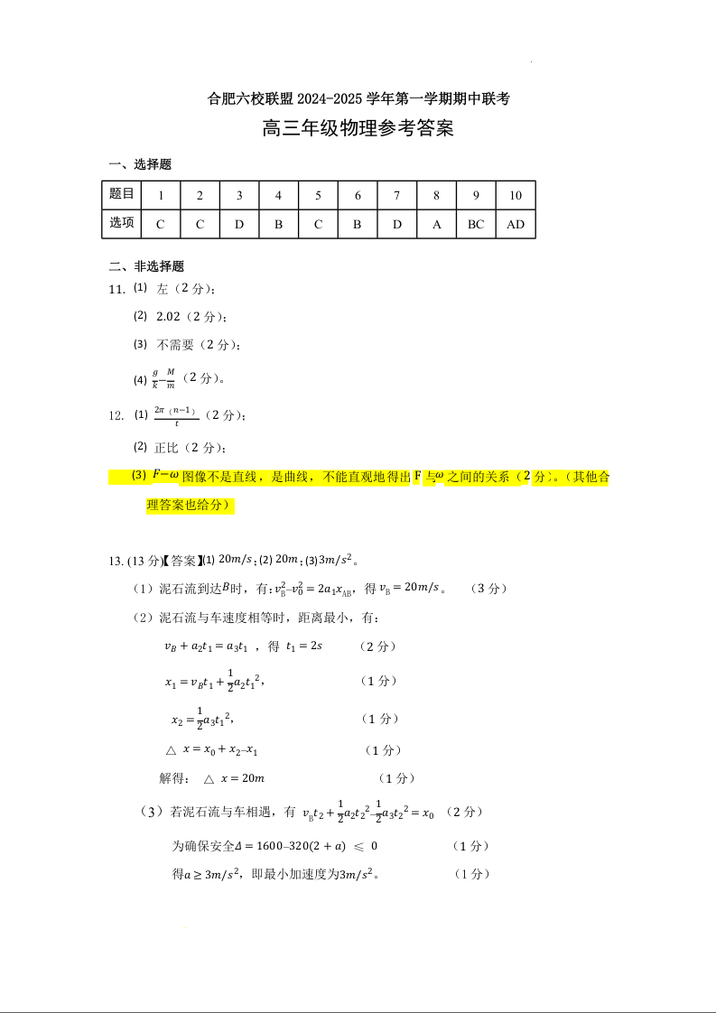安徽省合肥市普通高中六校联盟2025届高三上学期11月期中联考 物理答案