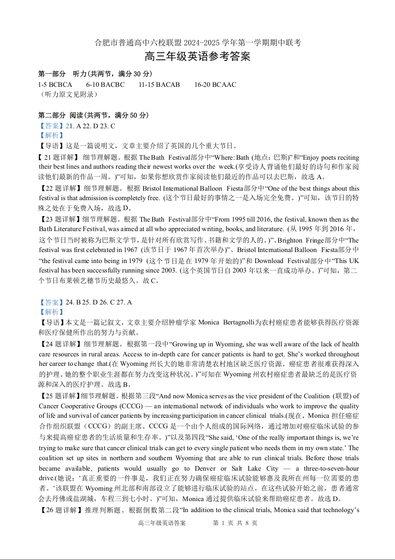 安徽省合肥市普通高中六校联盟2025届高三上学期11月期中联考 英语答案