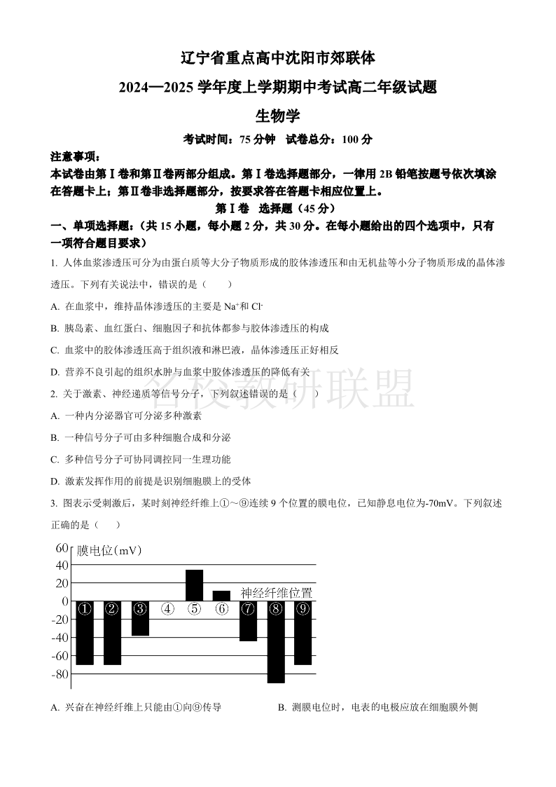 辽宁省重点高中沈阳市郊联体2024-2025学年高二上学期11月期中考试 生物