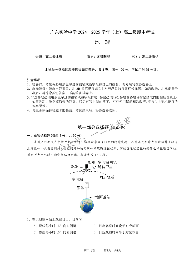 广东省实验中学2024-2025学年高二上学期期中考试 地理