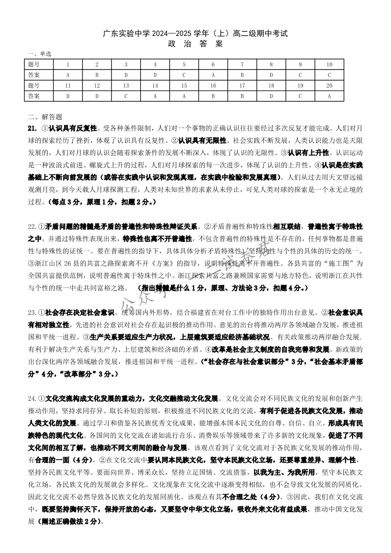 广东省实验中学2024-2025学年高二上学期期中考试 政治答案