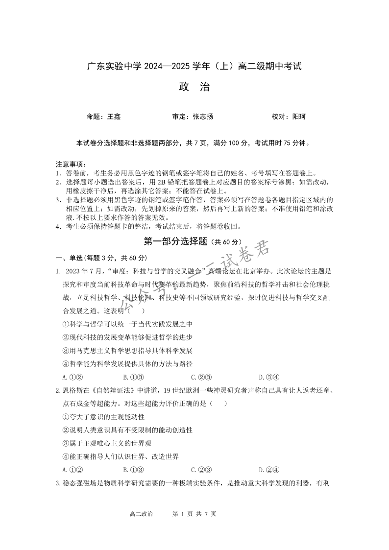 广东省实验中学2024-2025学年高二上学期期中考试 政治