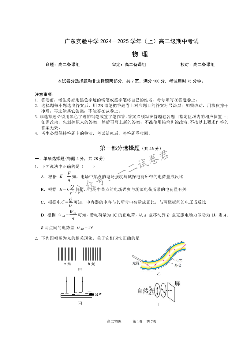 广东省实验中学2024-2025学年高二上学期期中考试 物理