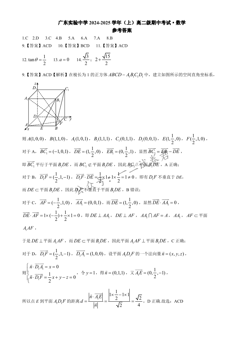 广东省实验中学2024-2025学年高二上学期期中考试 数学答案
