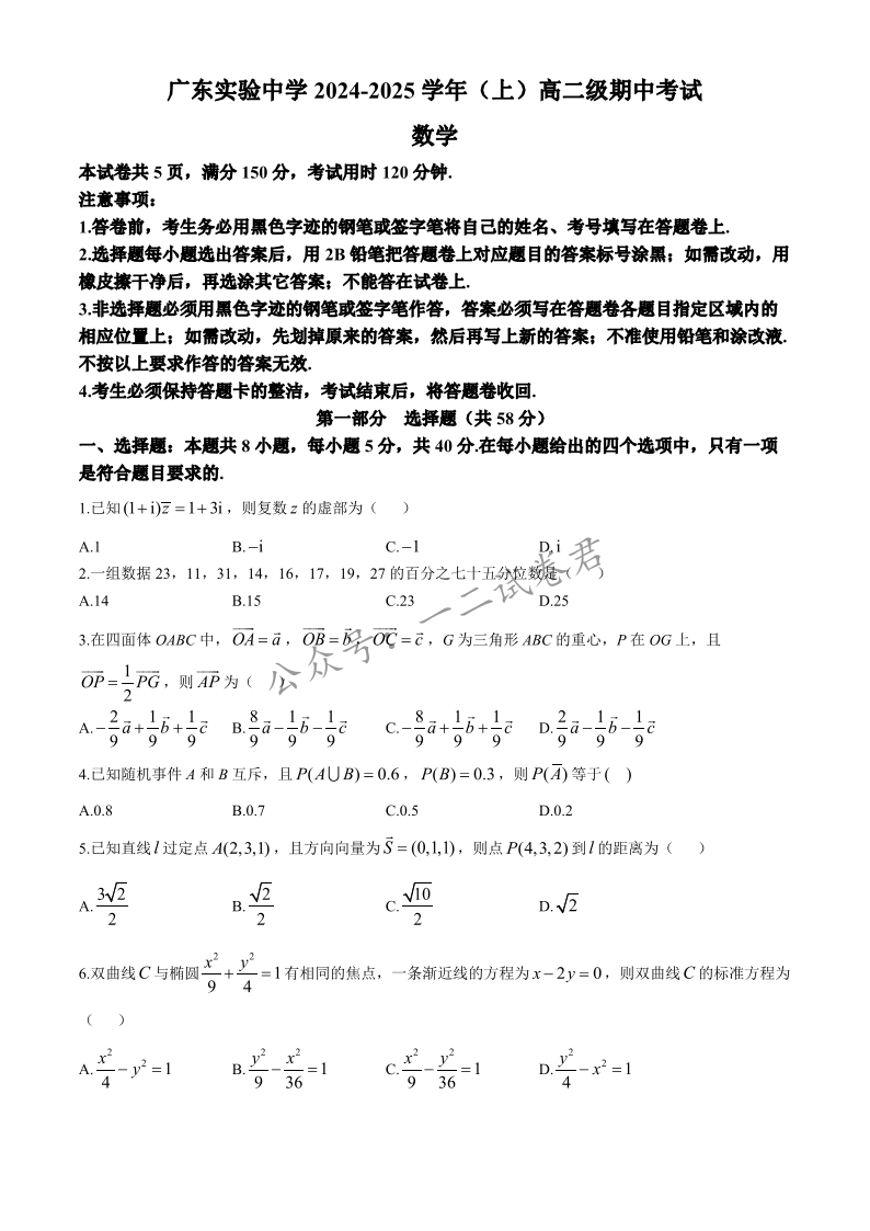 广东省实验中学2024-2025学年高二上学期期中考试 数学
