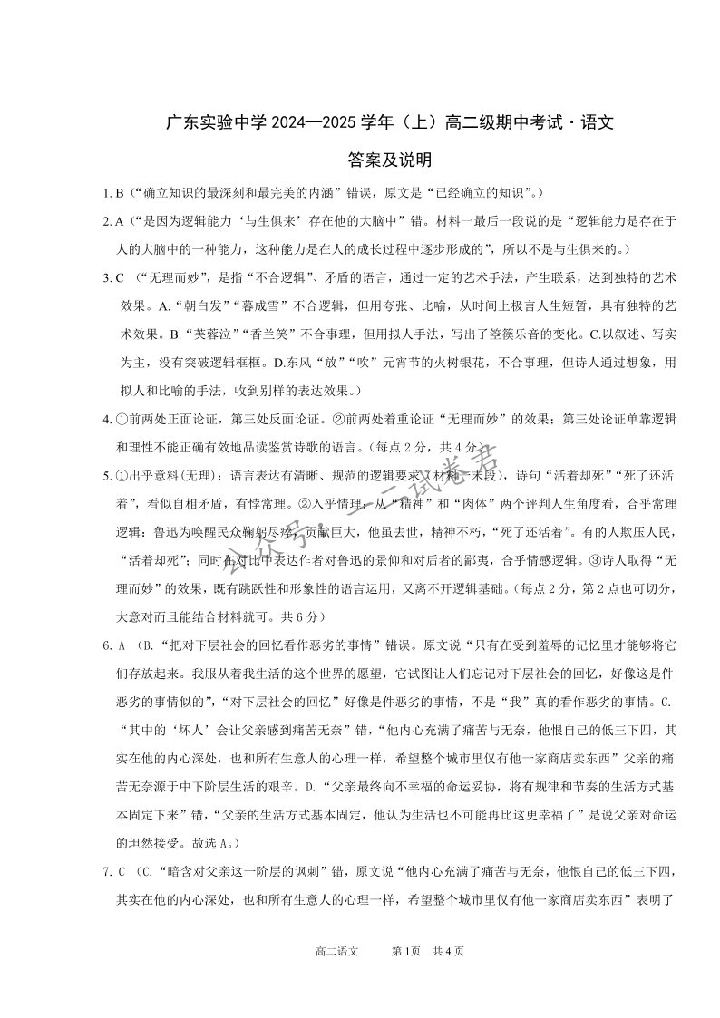 广东省实验中学2024-2025学年高二上学期期中考试 语文答案