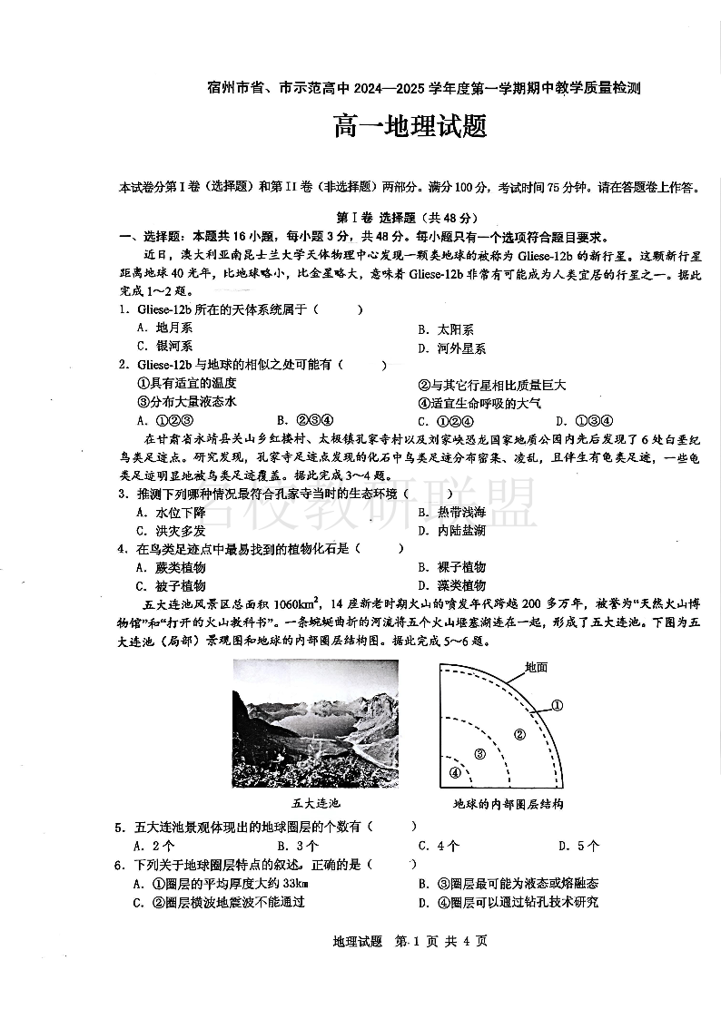 安徽省宿州市省、市示范高中2024-2025学年高一第一学期期中教学质量检测 地理