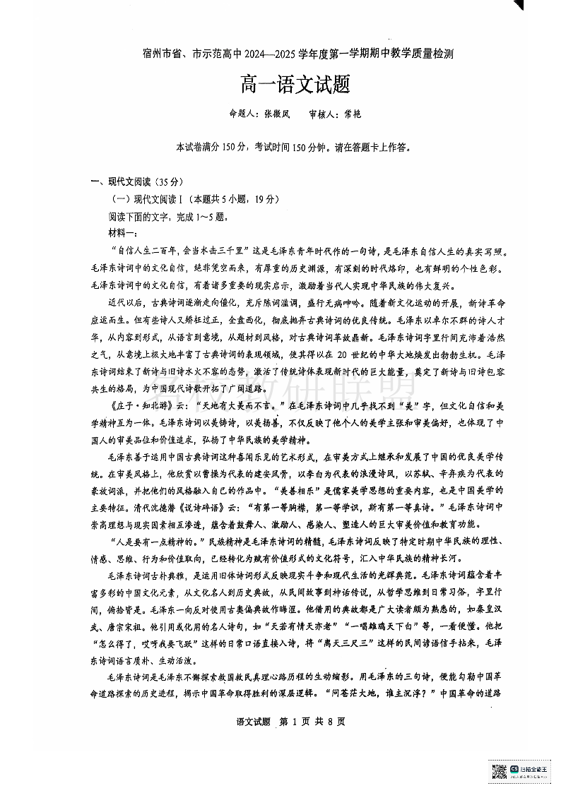 安徽省宿州市省、市示范高中2024-2025学年高一第一学期期中教学质量检测 语文