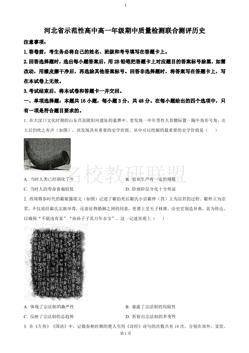 河北省示范性高中高一年级期中质量检测联合测评 历史