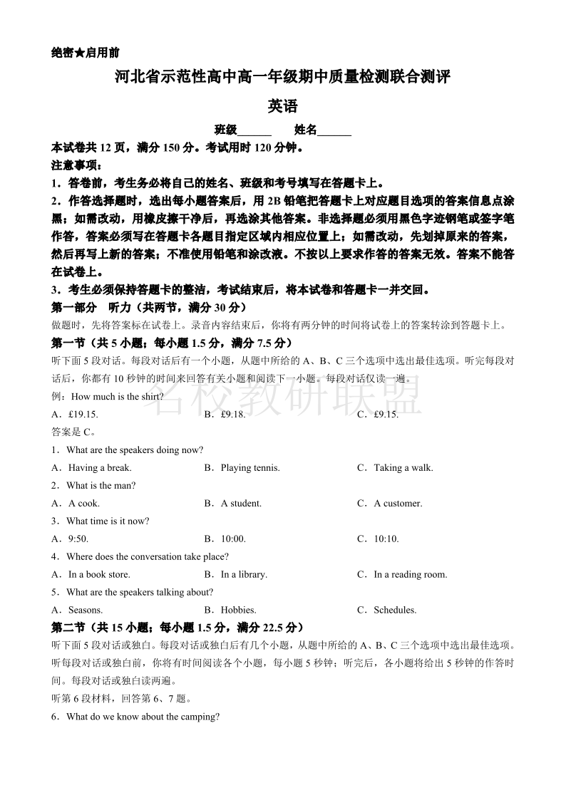 河北省示范性高中高一年级期中质量检测联合测评 英语
