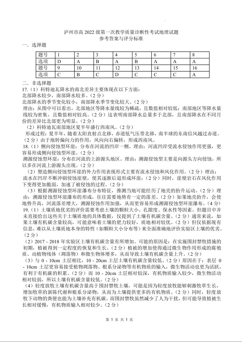 泸州市高2022级第一次教学质量诊断性考试 地理答案