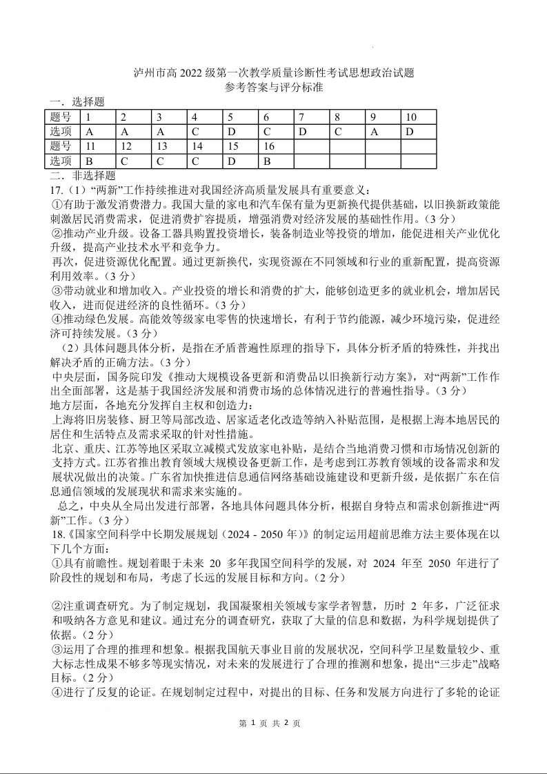 泸州市高2022级第一次教学质量诊断性考试 政治答案