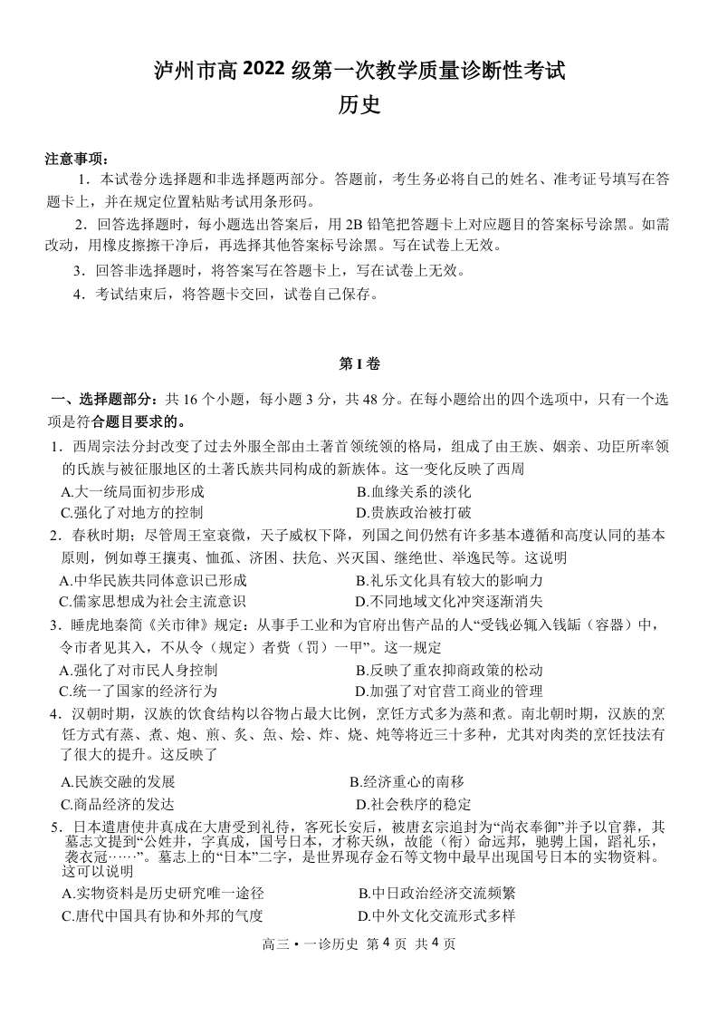 泸州市高2022级第一次教学质量诊断性考试 历史