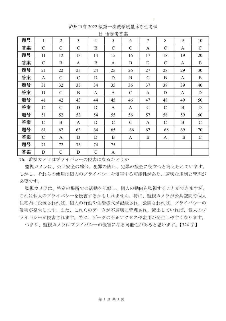 泸州市高2022级第一次教学质量诊断性考试 日语答案