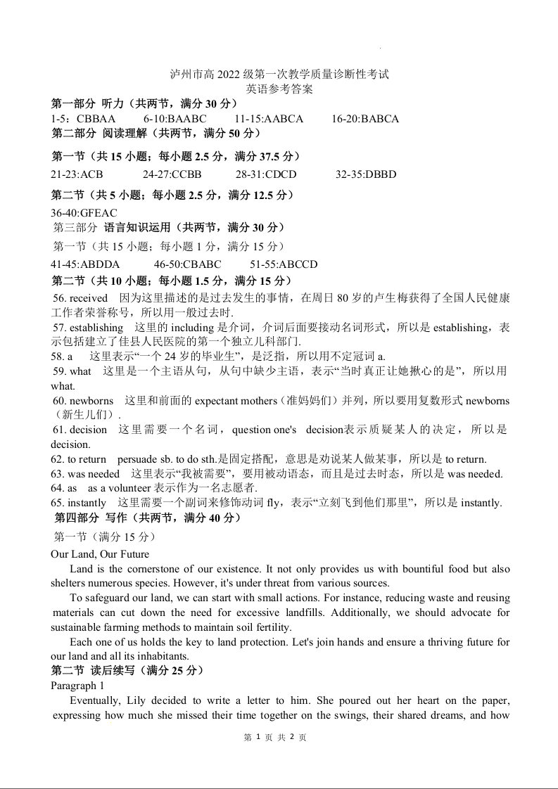 泸州市高2022级第一次教学质量诊断性考试 英语答案