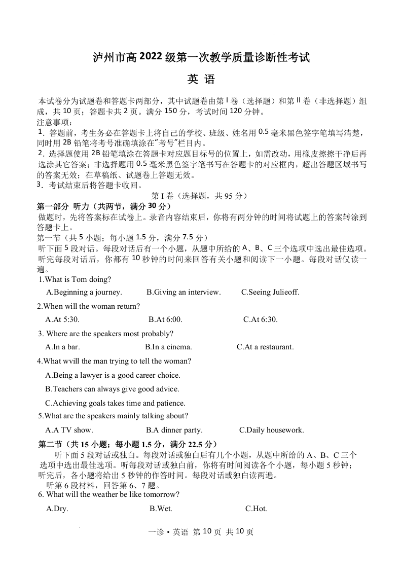 泸州市高2022级第一次教学质量诊断性考试 英语