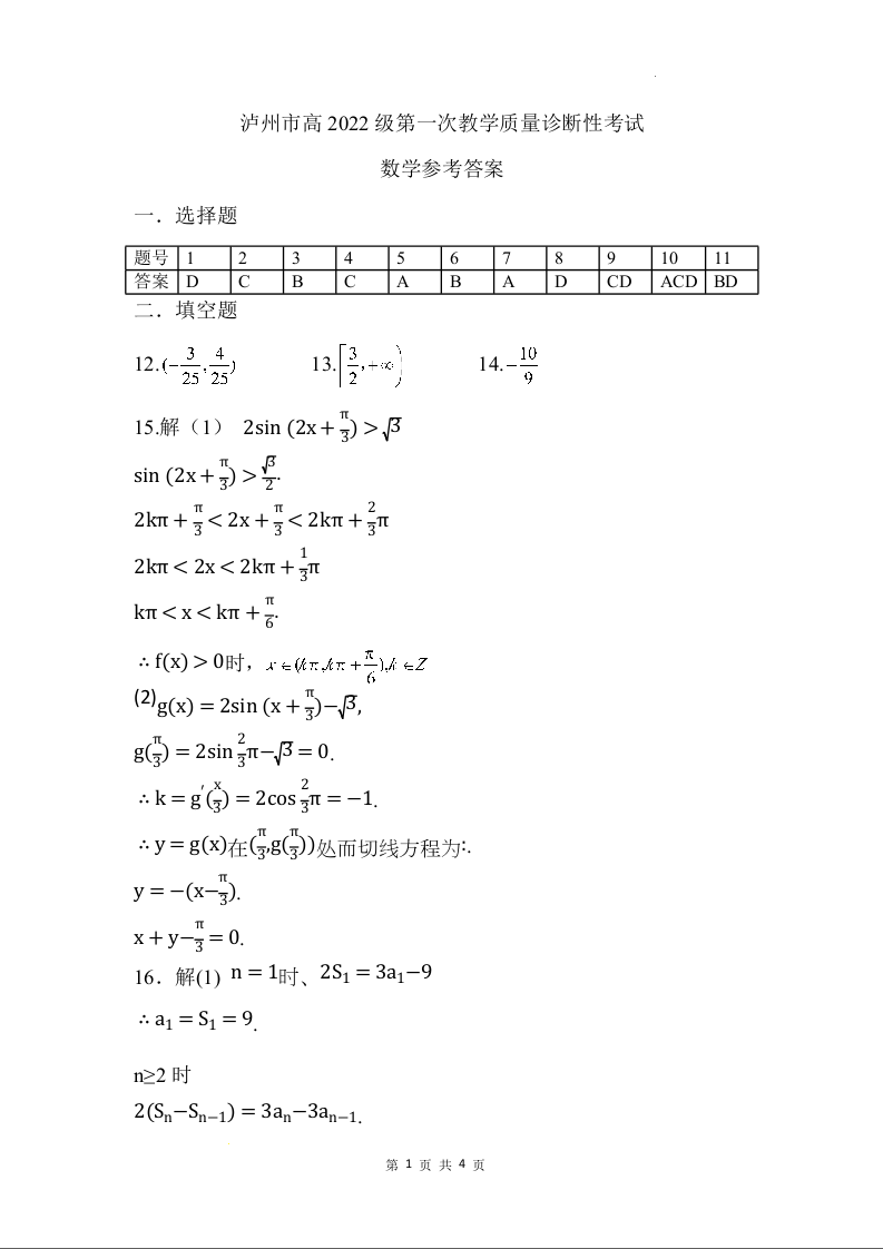 泸州市高2022级第一次教学质量诊断性考试 数学答案