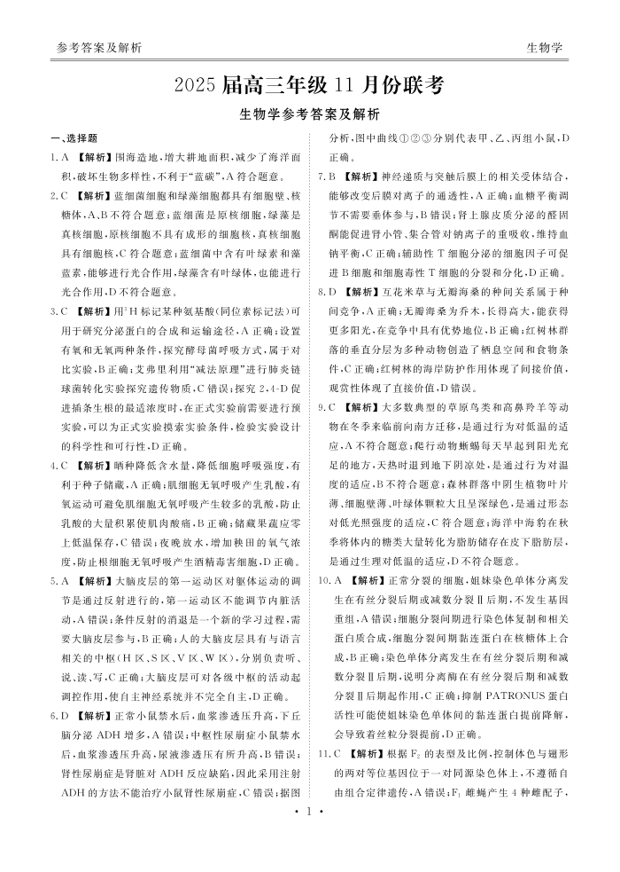 广东省衡水金卷2025届高三上学期11月大联考 生物答案