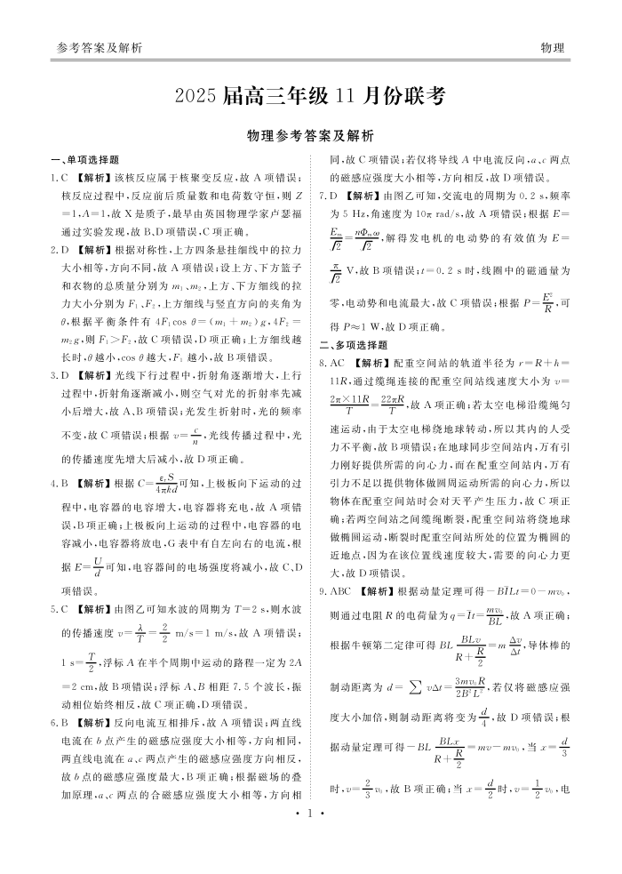广东省衡水金卷2025届高三上学期11月大联考 物理答案