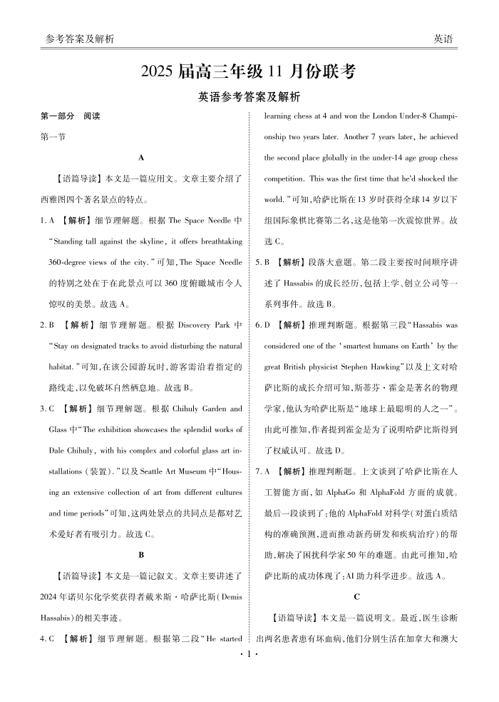 广东省衡水金卷2025届高三上学期11月大联考 英语答案
