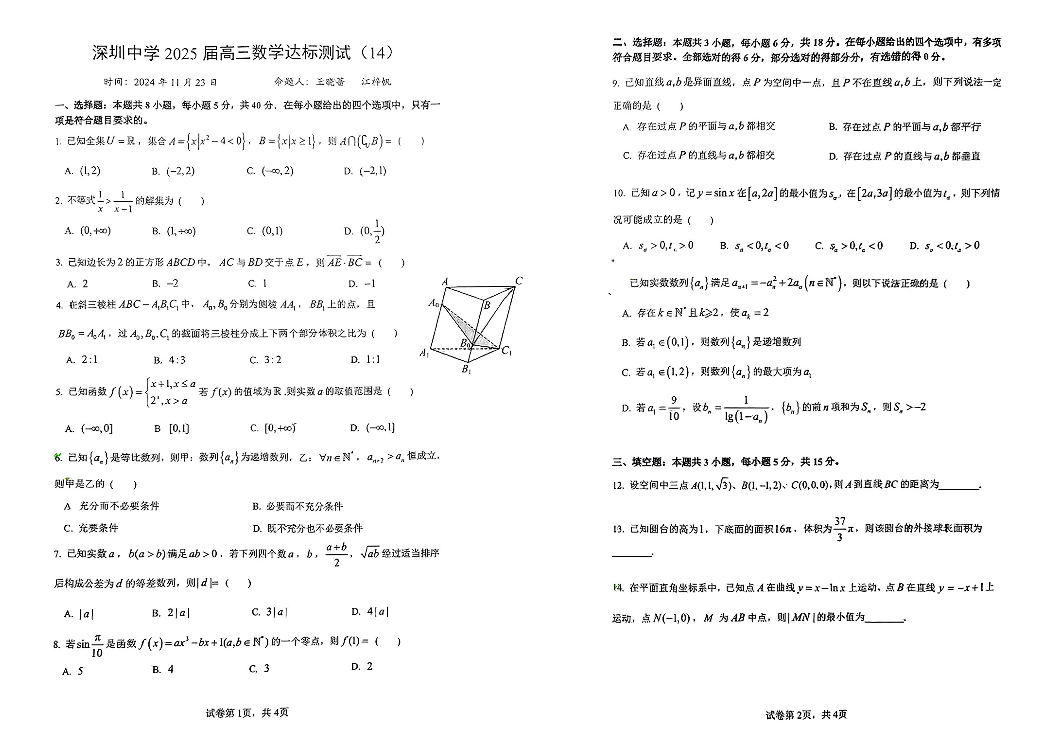 深圳中学2024-2025学年高三上学期11月月考