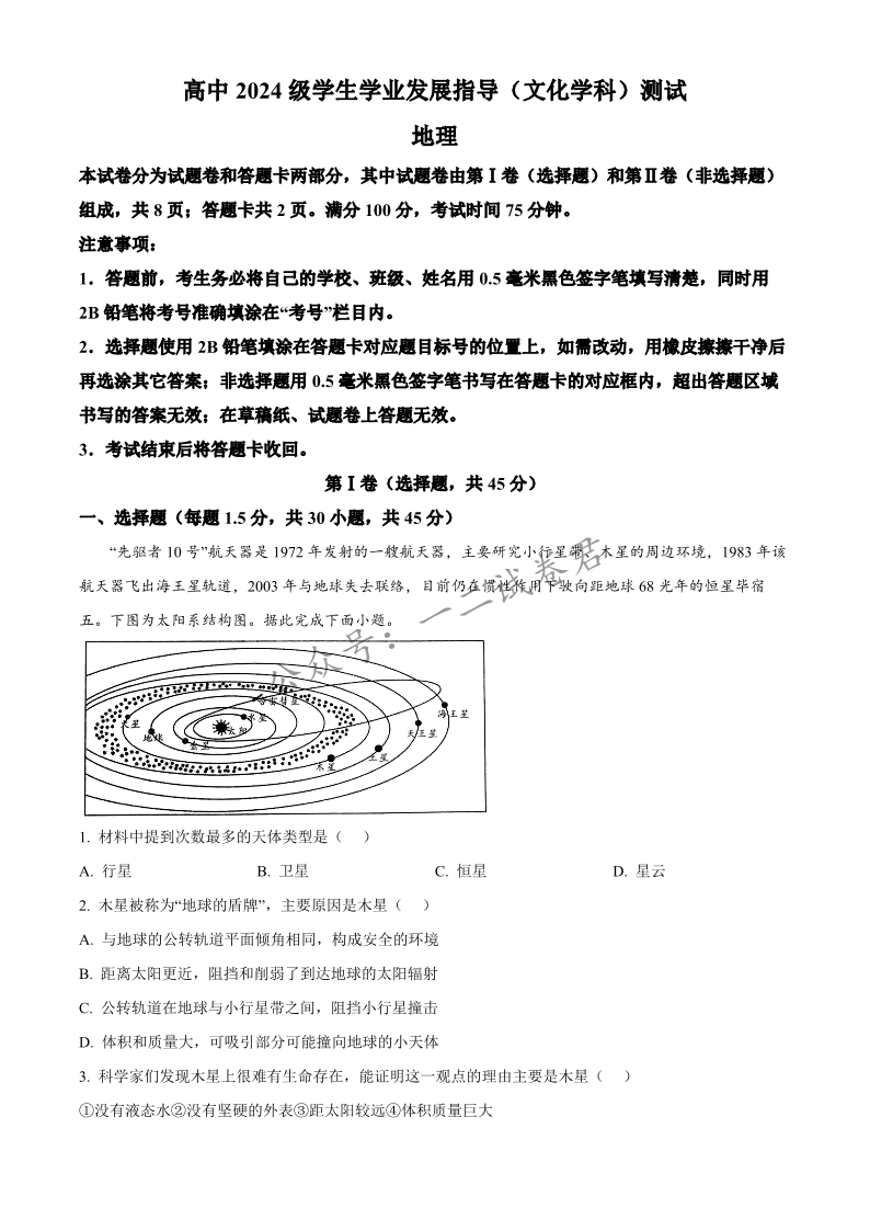 四川省绵阳市2024-2025学年高一上学期11月期中考试 地理