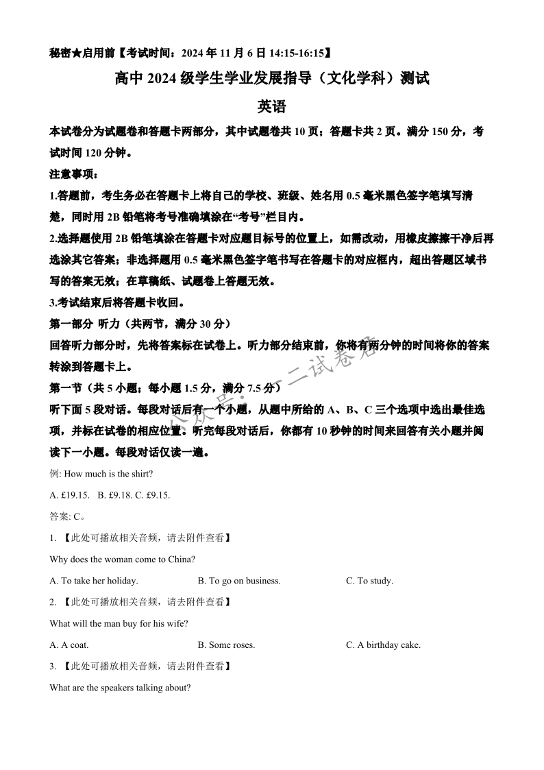 四川省绵阳市2024-2025学年高一上学期11月期中考试 英语