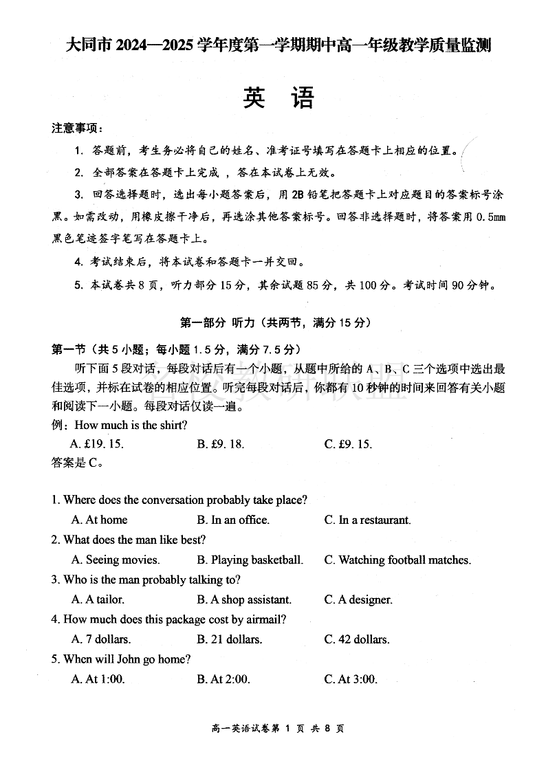 山西省大同市2024-2025学年高一上学期11月期中考试 英语
