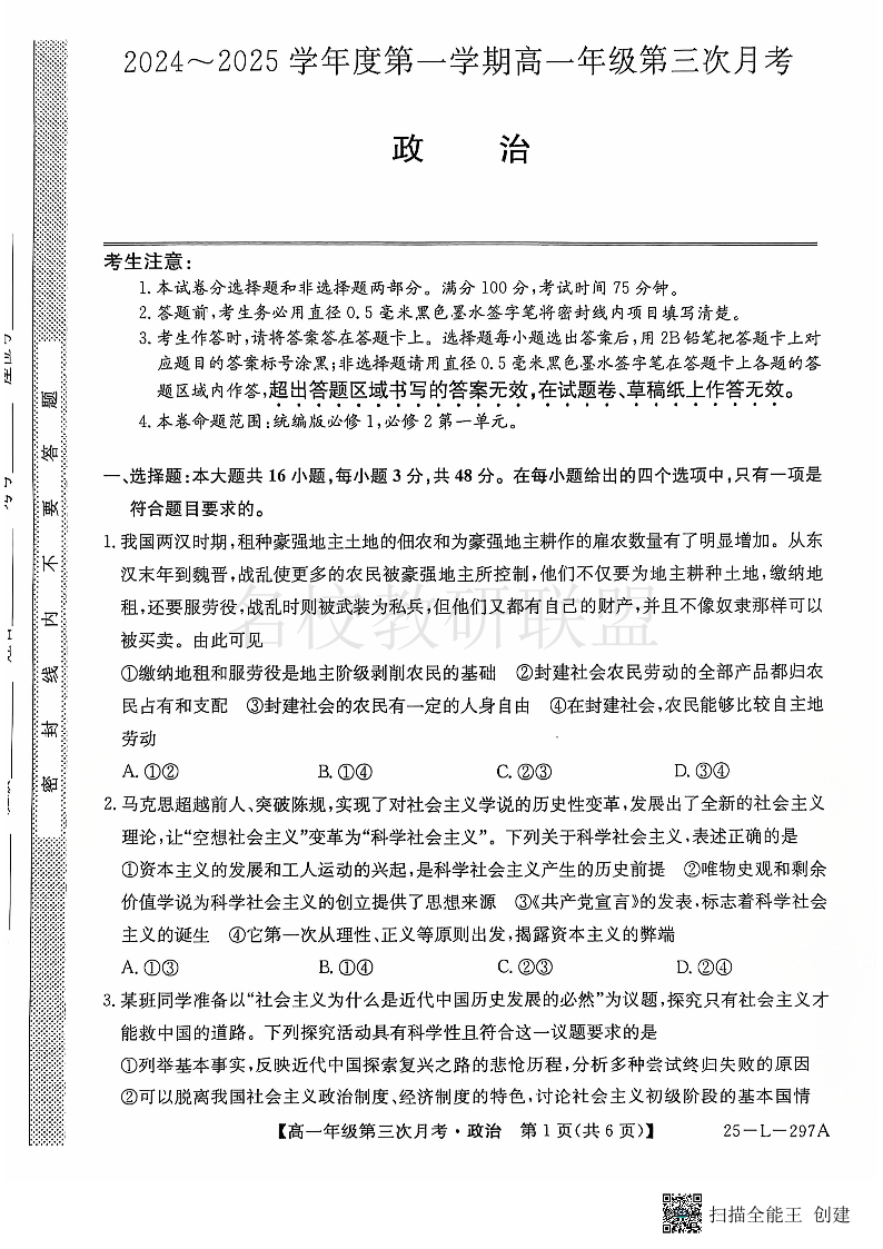 河北省联考2024-2025学年高一上学期第三次月考 政治
