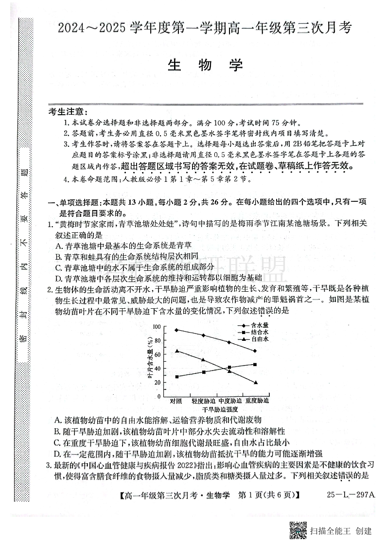 河北省联考2024-2025学年高一上学期第三次月考 生物