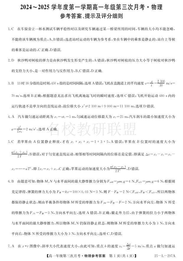河北省联考2024-2025学年高一上学期第三次月考 物理答案