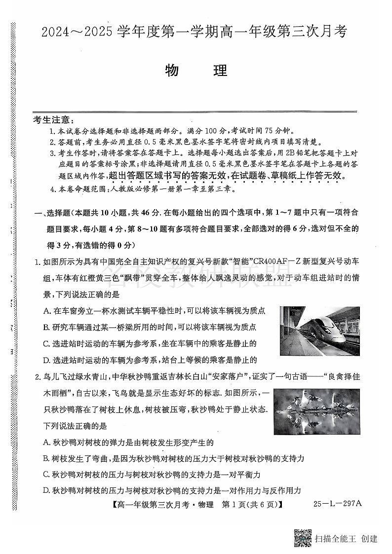 河北省联考2024-2025学年高一上学期第三次月考 物理