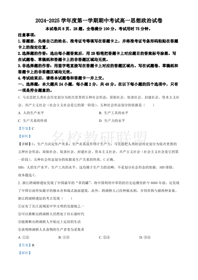 广东省珠海市四校2024-2025 学年高一上学期期中联考 政治答案