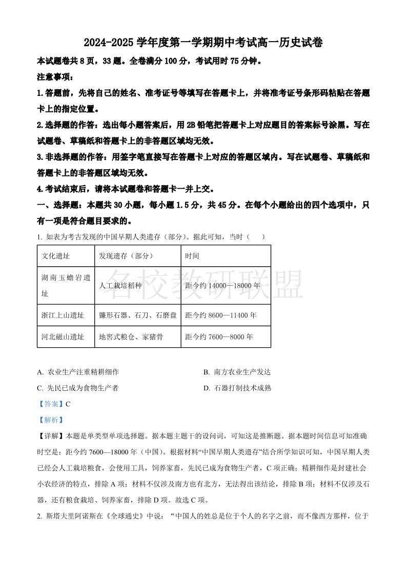 广东省珠海市四校2024-2025 学年高一上学期期中联考 历史答案