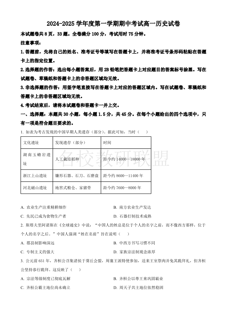 广东省珠海市四校2024-2025 学年高一上学期期中联考 历史