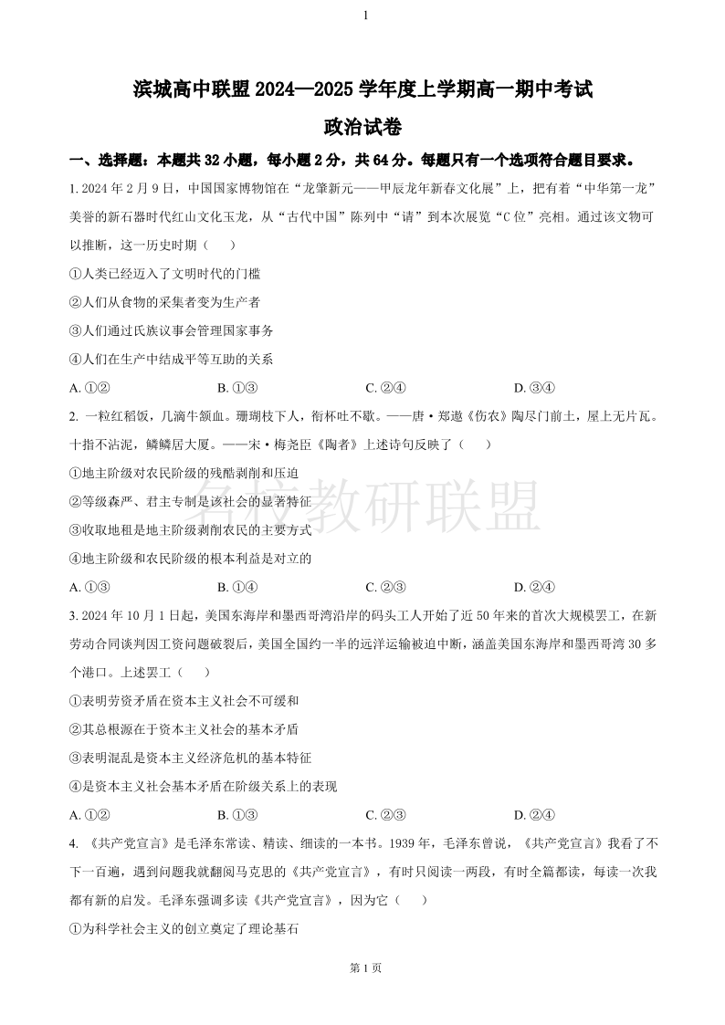 大连市滨城高中联盟2024-2025学年度上学期高一期中考试 政治