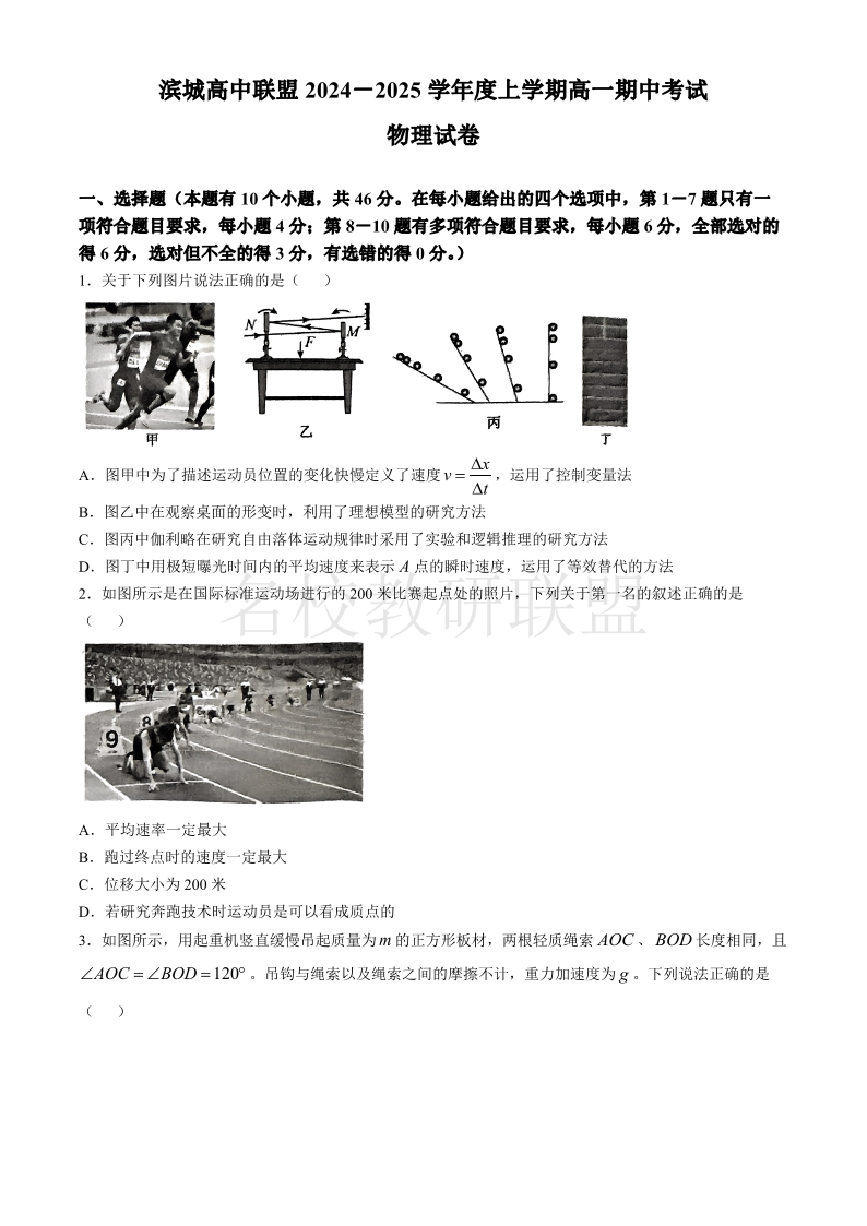 大连市滨城高中联盟2024-2025学年度上学期高一期中考试 物理