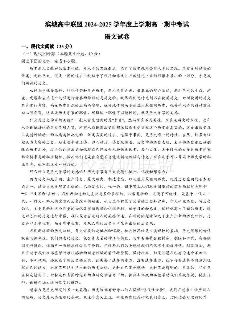 大连市滨城高中联盟2024-2025学年度上学期高一期中考试 语文