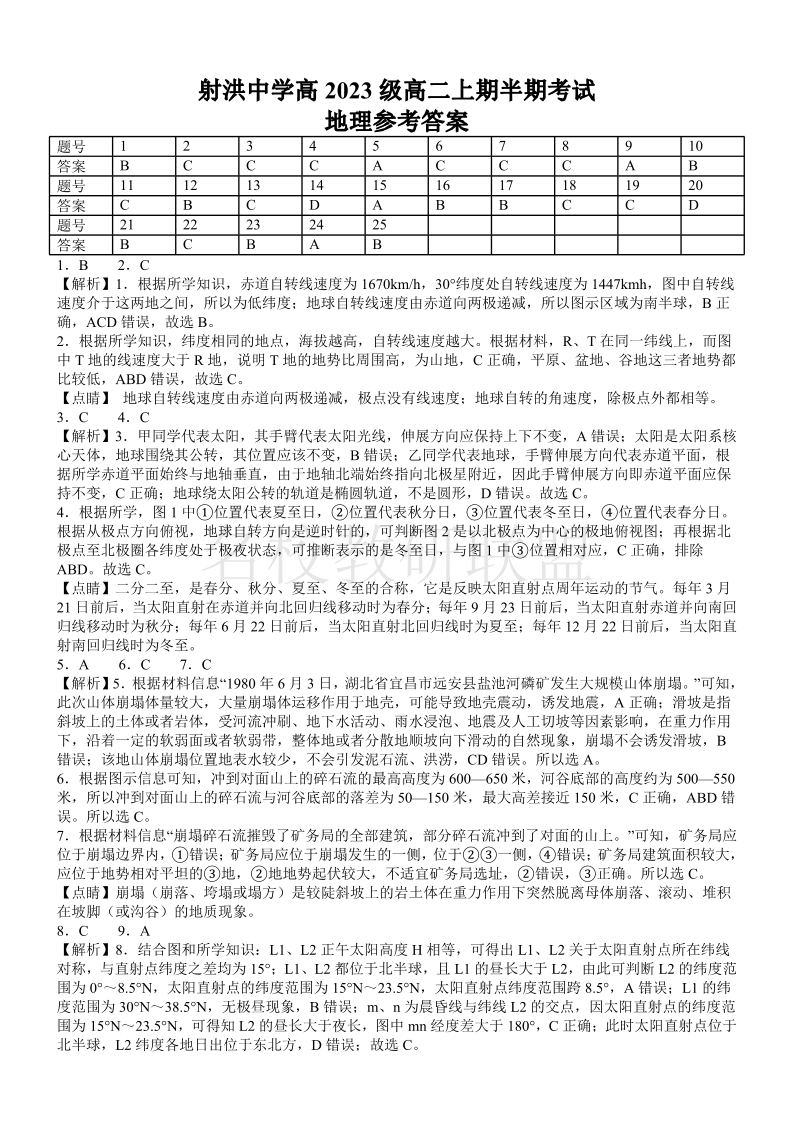 四川省遂宁市射洪中学2024-2025学年高二上学期期中考试 地理答案