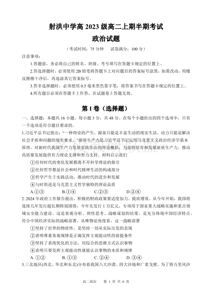四川省遂宁市射洪中学2024-2025学年高二上学期期中考试 政治