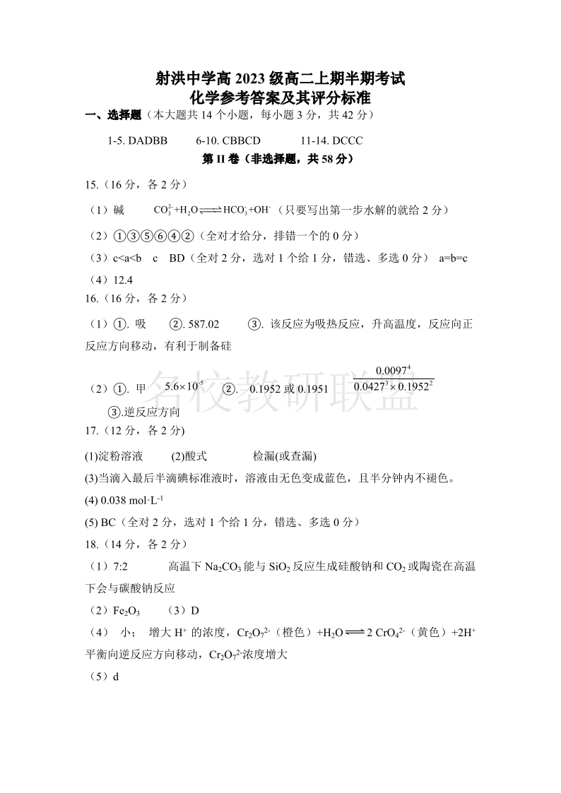 四川省遂宁市射洪中学2024-2025学年高二上学期期中考试 化学答案
