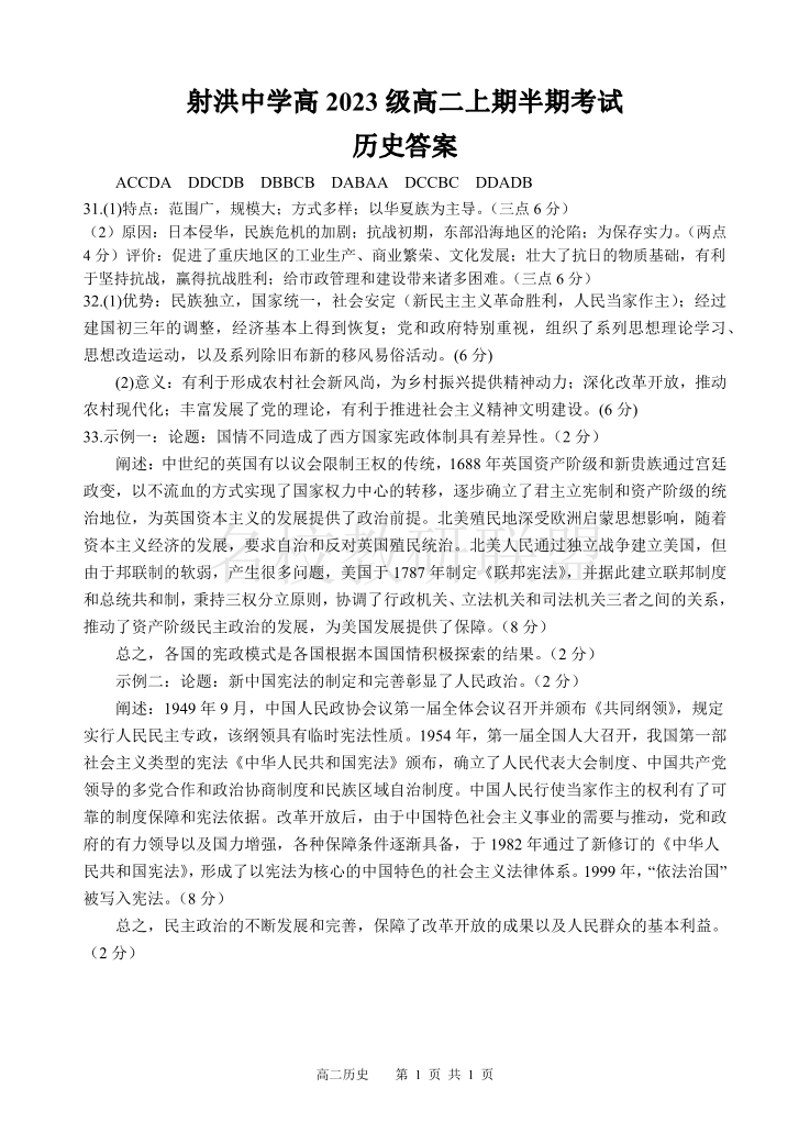 四川省遂宁市射洪中学2024-2025学年高二上学期期中考试 历史答案